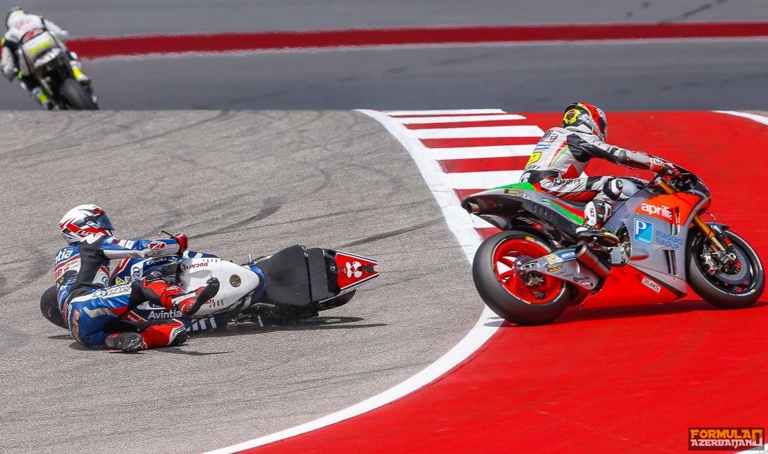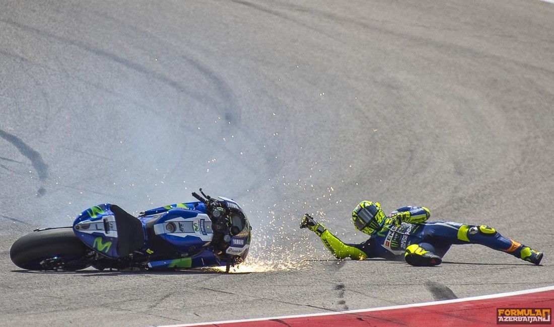 Bir qədər əvvəl isə Valentino Rossi yıxılıb – Doktor 2014-cü ilin Araqon yarışından sonra birinci dəfə yıxılıb.