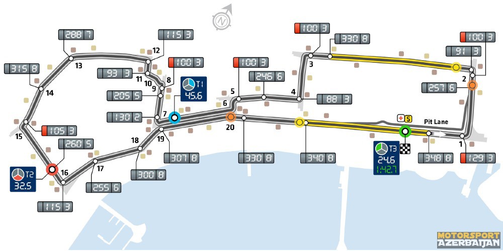DRS zonalarından biri Neftçilər prospektində uzun düzlükdə yerləşir. 20-ci döngənin apeksində sürücülər arasındakı interval ölçüləcək, əgər bu fərq 1 saniyədən az olarsa, 347 metrdən sonra arxa qanadın hərəkətli elementini aktivləşdirmək mümkün olacaq. Digər ölçmə nöqtəsi isə Təhlükəsizlik Maşınının ikinci xəttində yerləşir, ikinci döngədən 52 metr sonra isə sistemi aktiv etmək olar.