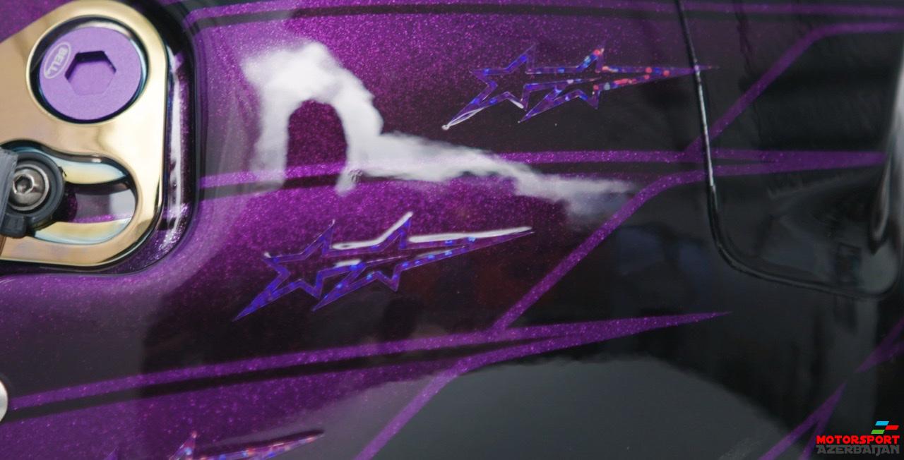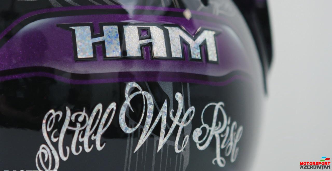 Dəbilqədə bənövşəyi rənglərdən də istifadə olunub və üzərinə Black Lives Matter şüarı yazılıb. Bundan başqa Həmiltonun bütün dəbilqələrində olan ənənəvi Still I Rise şüarı Still We Rise olaraq dəyişdirilib.